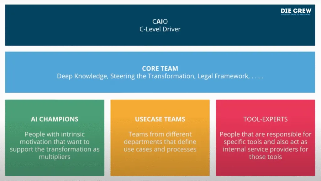 - Use Case Teams: Specialized groups identifying and implementing AI applications in each department