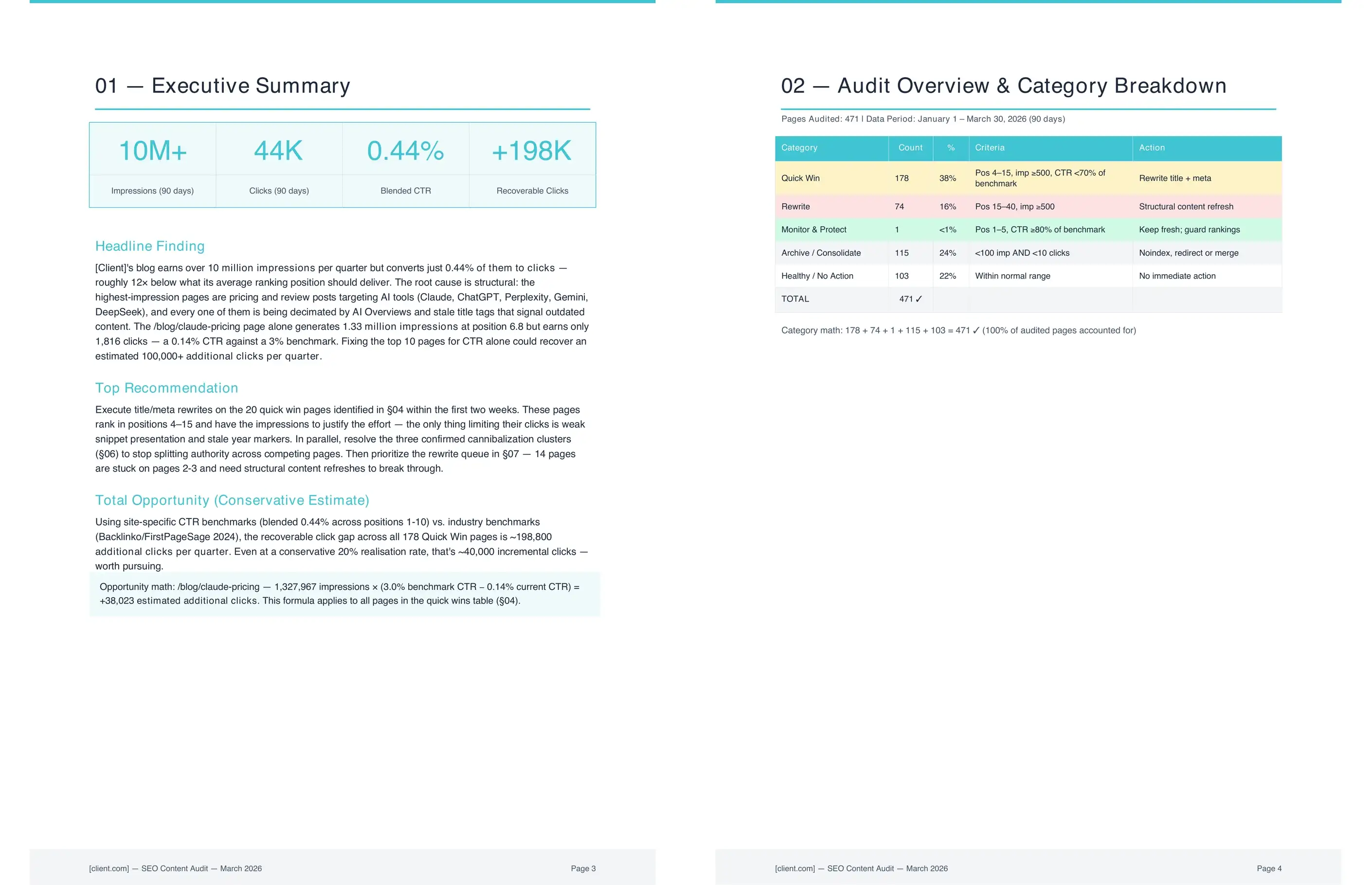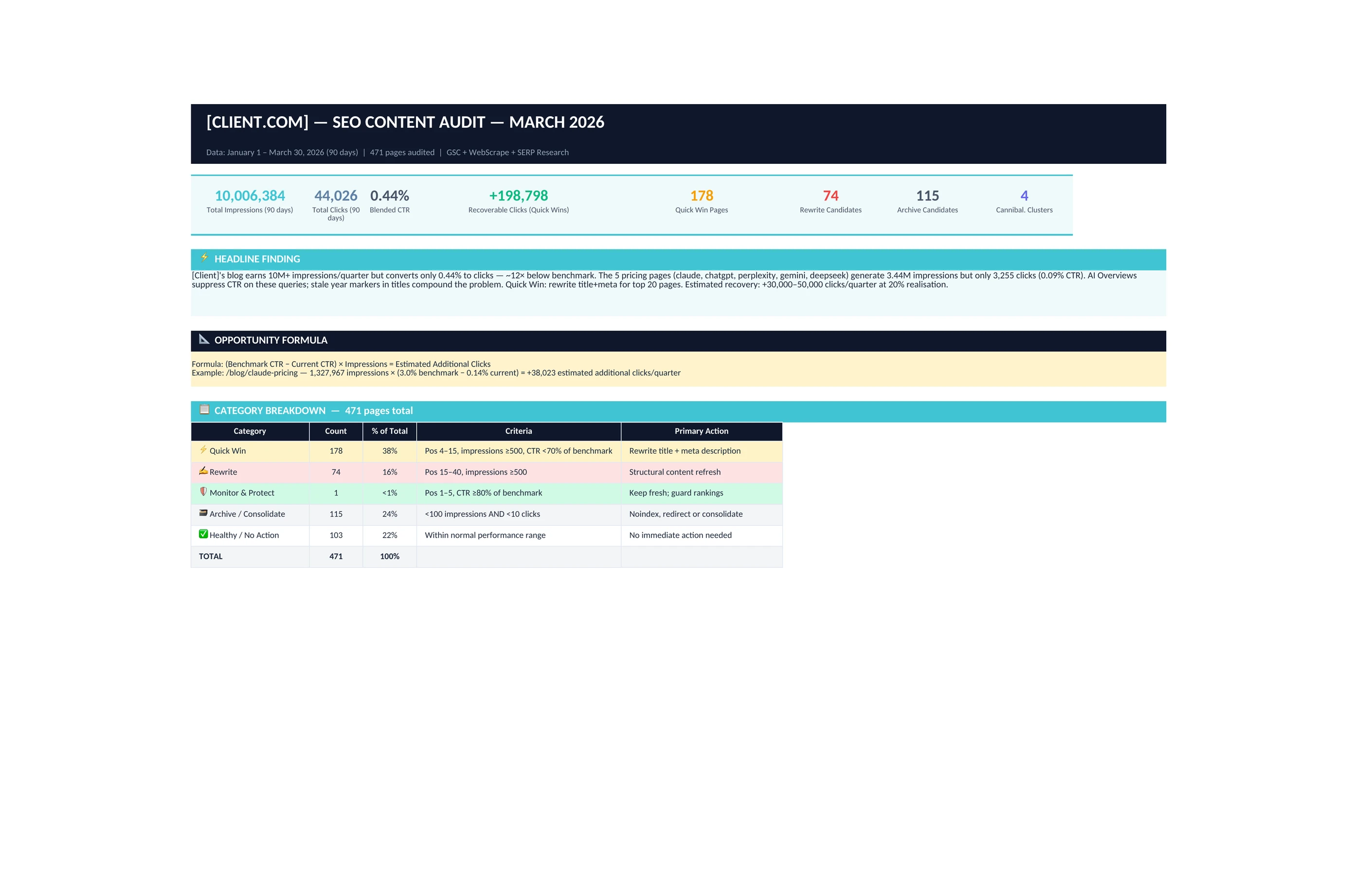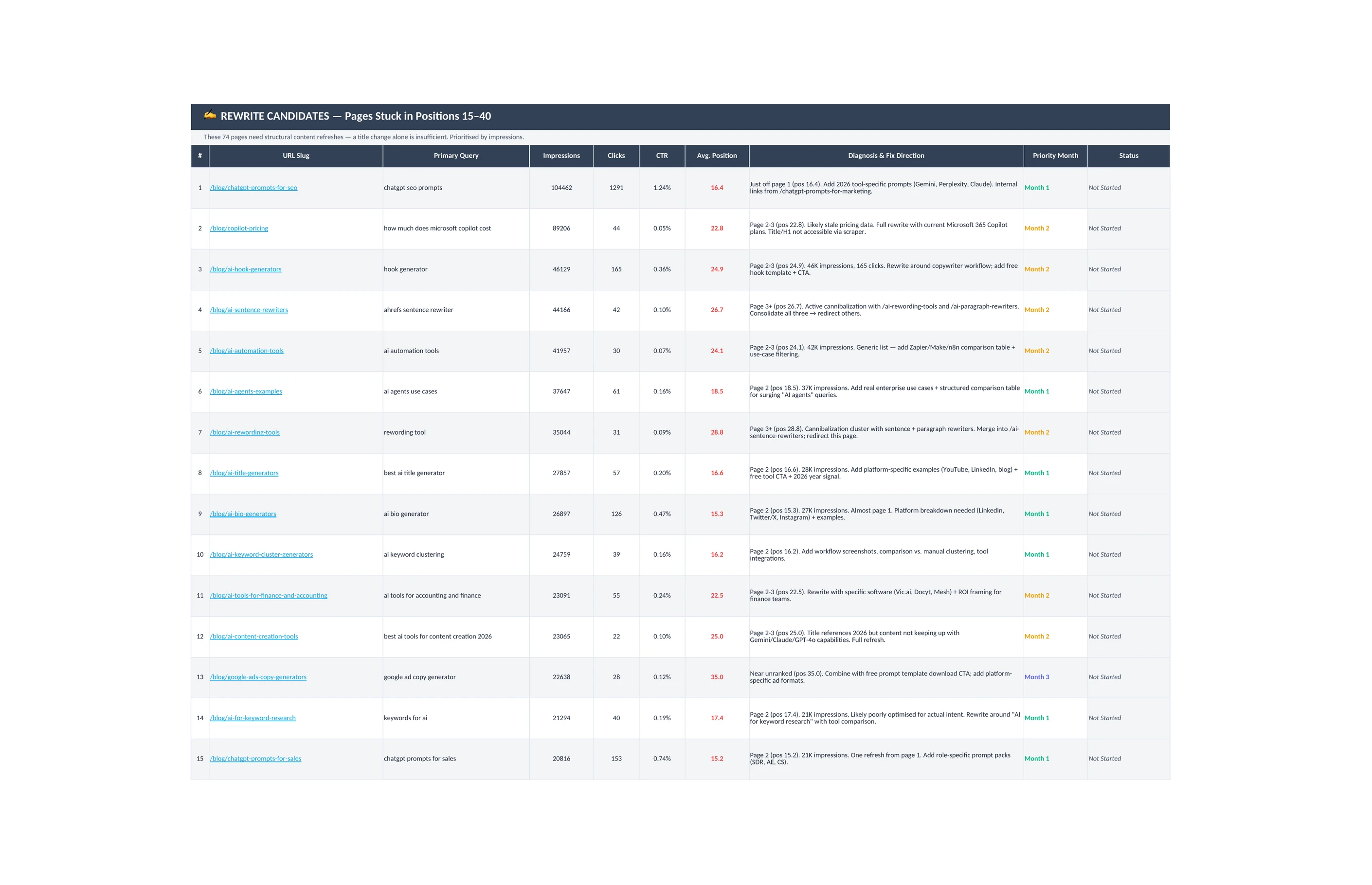The team starts with a full picture of which pages are earning their keep and which ones aren't. Every page on the site gets sorted into one of five buckets: quick wins that are close to performing (ranking on page 1-2 but underclicking), rewrite candidates stuck on page 2-3 with enough search volume to justify the effort, pages to protect, archive candidates, and healthy pages to leave alone.