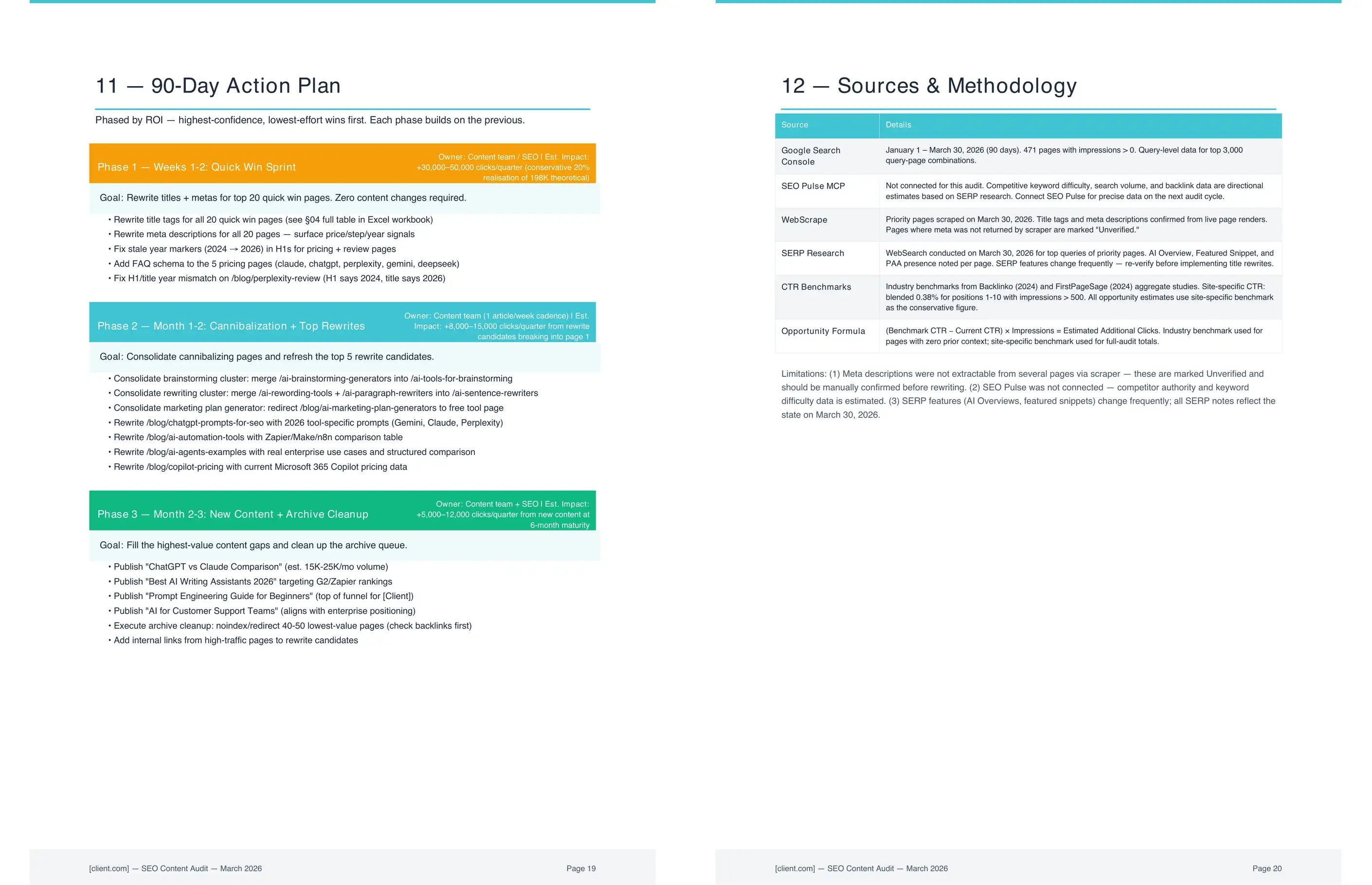 Most SEO audits check pages against a best-practice checklist: title length, meta description present, heading structure. That approach treats every page equally. When the audit starts from actual search performance data, the priorities shift. A page with 1.3 million impressions and a 0.14% CTR is a different problem than a page with 200 impressions and no clicks. The first needs a better title tag. The second might not be worth fixing at all. Starting from search data means the team works on the pages that will actually move the numbers.