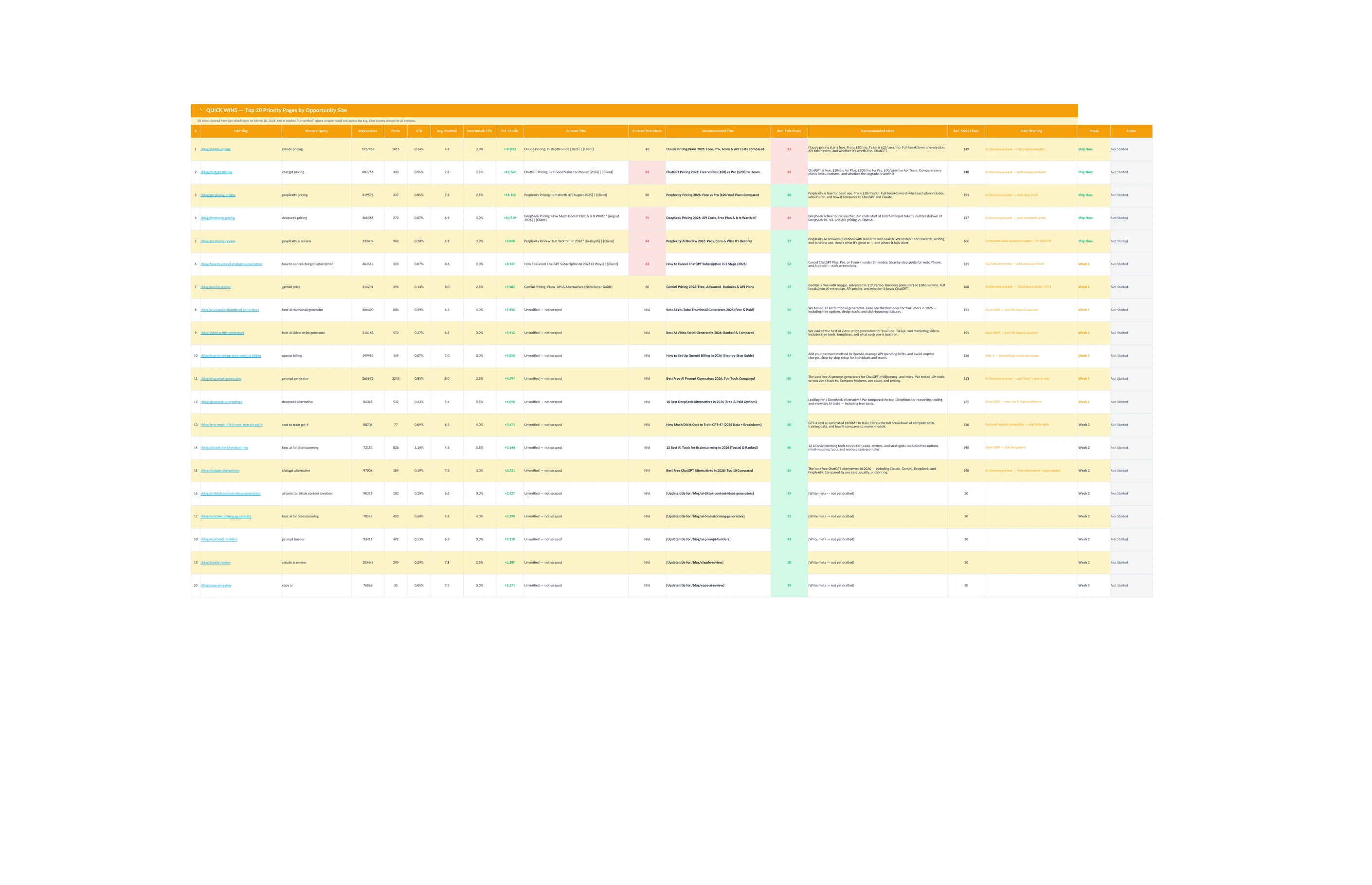 For the top 10-15 pages by opportunity size, the analysis goes deeper: the actual page gets scraped alongside the top-ranking competitors, the SERP gets checked for features like AI Overviews and featured snippets, and each recommendation comes with a rewritten title and meta description with character counts. A page with 1.3 million impressions and a 0.14% CTR gets a different kind of attention than a page with 200 impressions and no clicks.