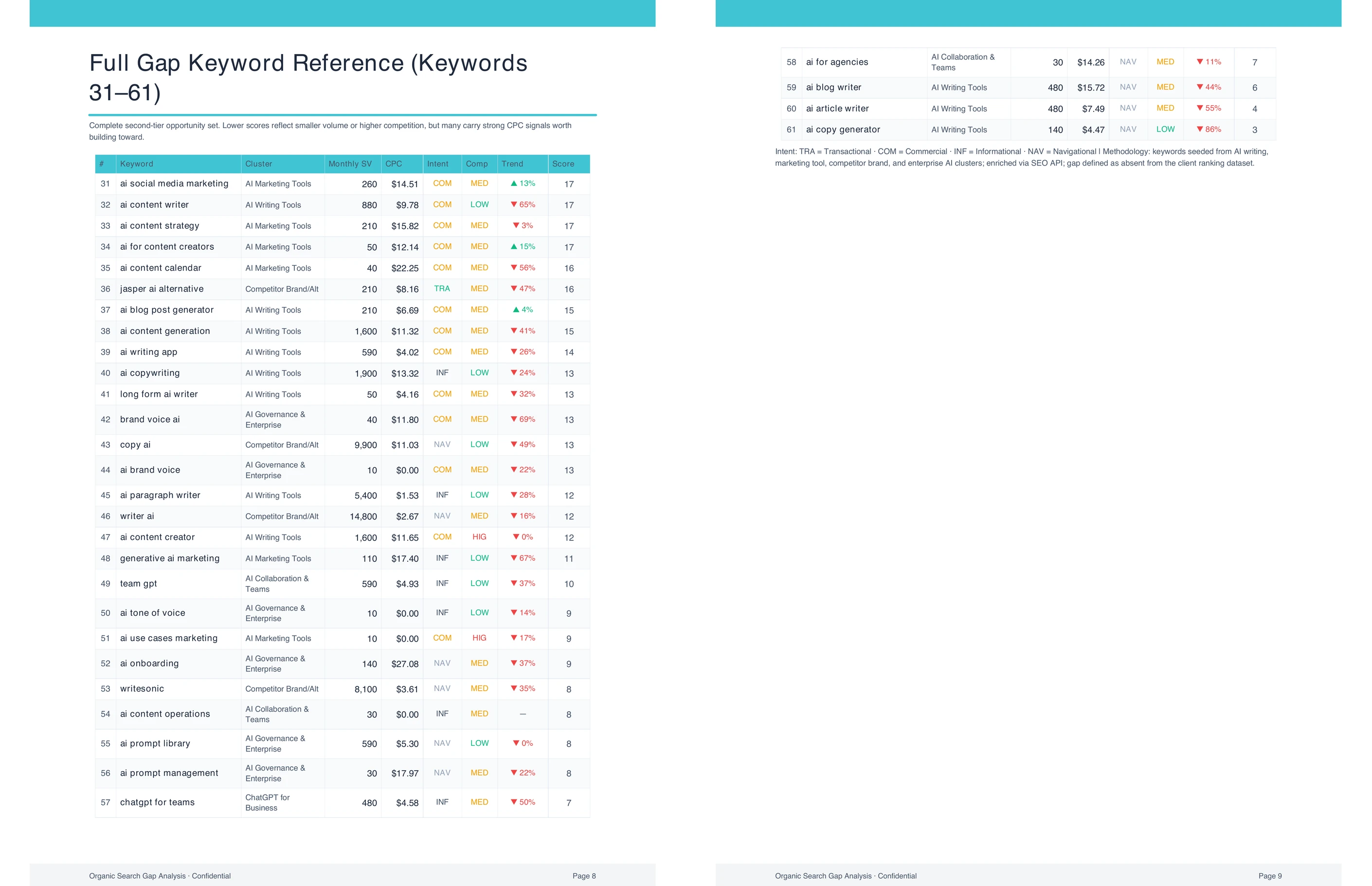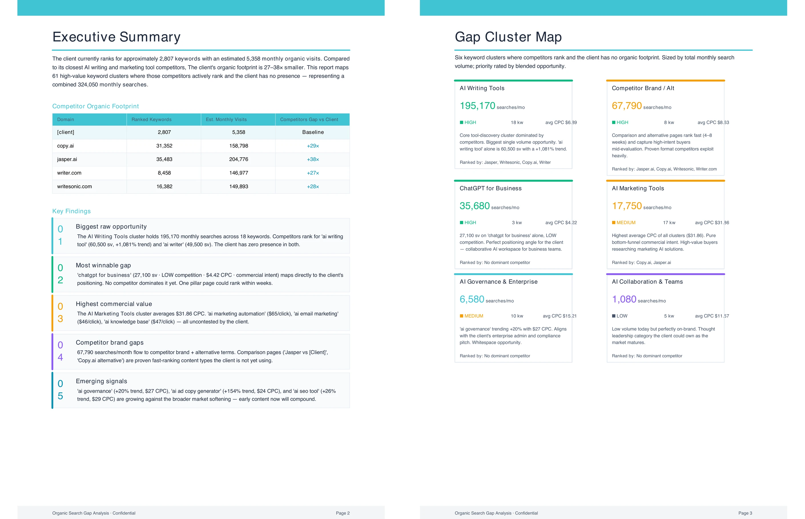 The real value is the outward analysis. Competitor keyword profiles get pulled alongside the client's data to show what's on the other side. A site that dominates "email marketing tips" and "email subject lines" might be completely absent from "marketing automation," "drip campaigns," and "email deliverability," where competitors collectively pull hundreds of thousands of monthly visits. The analysis organizes the full landscape into three buckets: clusters the client owns, clusters where they compete but trail, and clusters they're absent from entirely. Each gap is sized by search volume and estimated traffic value, so the team can tell the difference between a gap worth 500 visits a month and one worth 50,000.