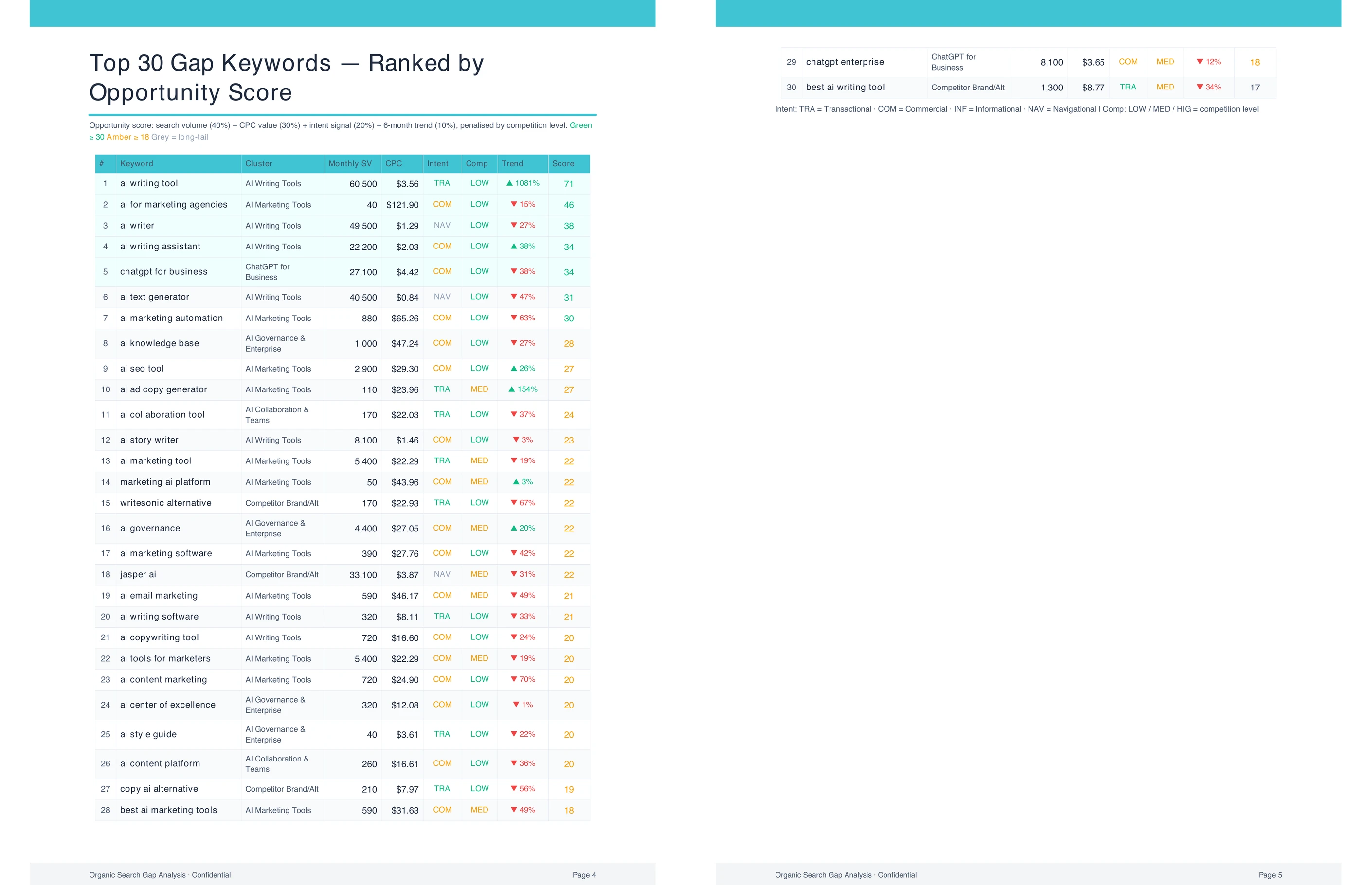 The final opportunity list prioritizes gaps by a combination of volume, difficulty, and business relevance, so the team starts with the ones most likely to pay off.