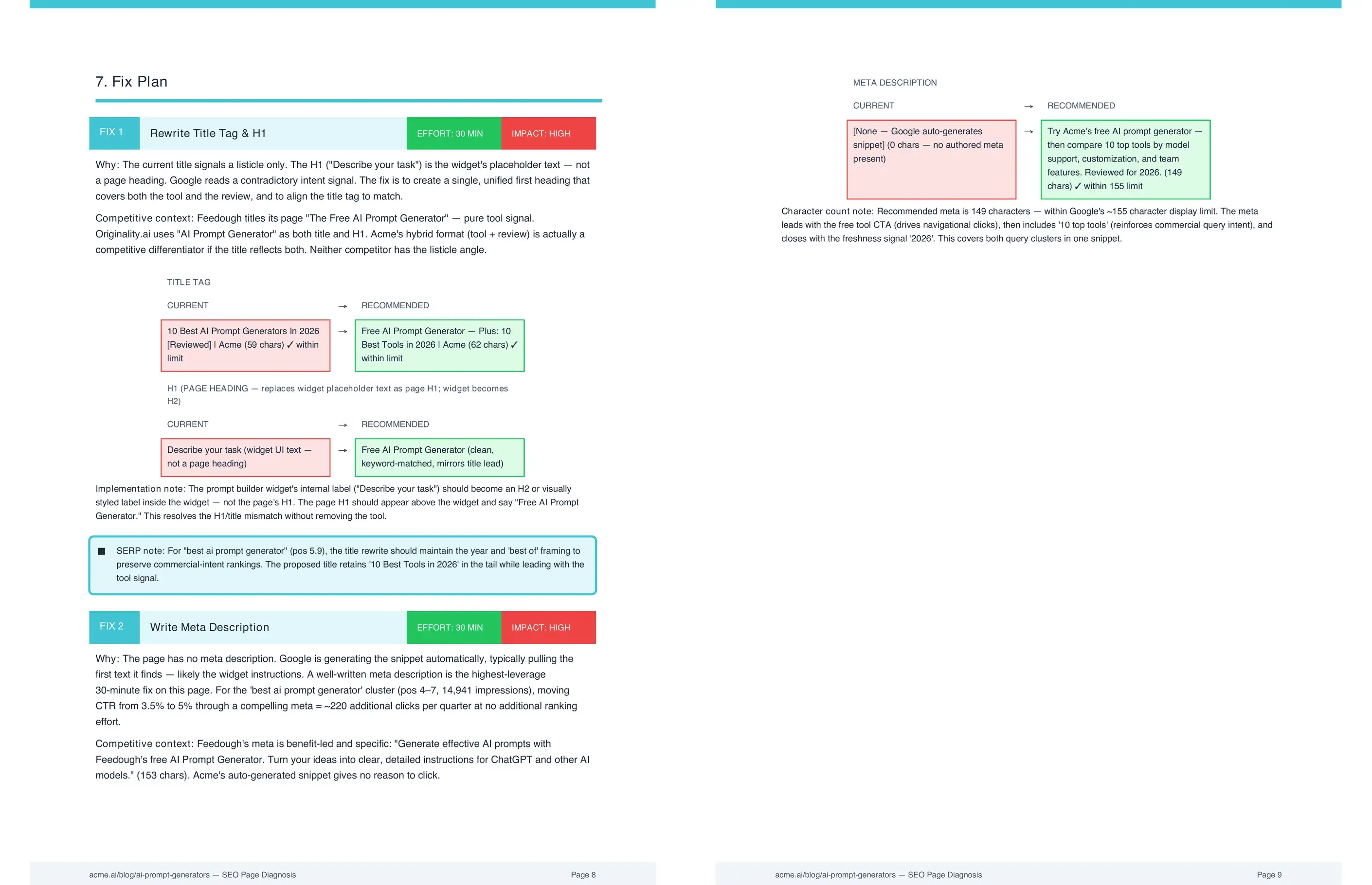 The natural instinct when a page underperforms is to rewrite the title or add more content. But the fix depends on the cause. A page stuck at position 16 has a content depth or authority problem, not a title tag problem. A page at position 4 with 2% CTR when the benchmark is 7% has a SERP presentation problem. A page losing ground to a specific competitor needs the specific elements that competitor added. The diagnosis separates these causes so the team works on the right fix, not the obvious one.