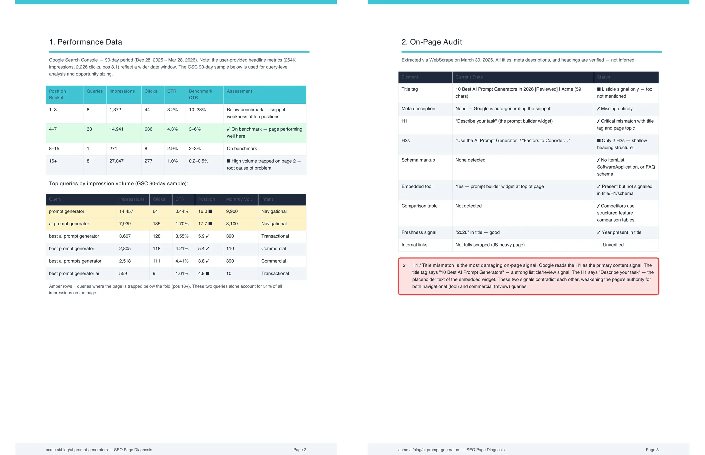 The team gets the full picture for one page: every query driving impressions, how CTR breaks down by query, and where position has moved over time. The actual page gets checked against what's live, not what the CMS says: the real title tag, meta description, heading structure, and content depth as Google sees them.