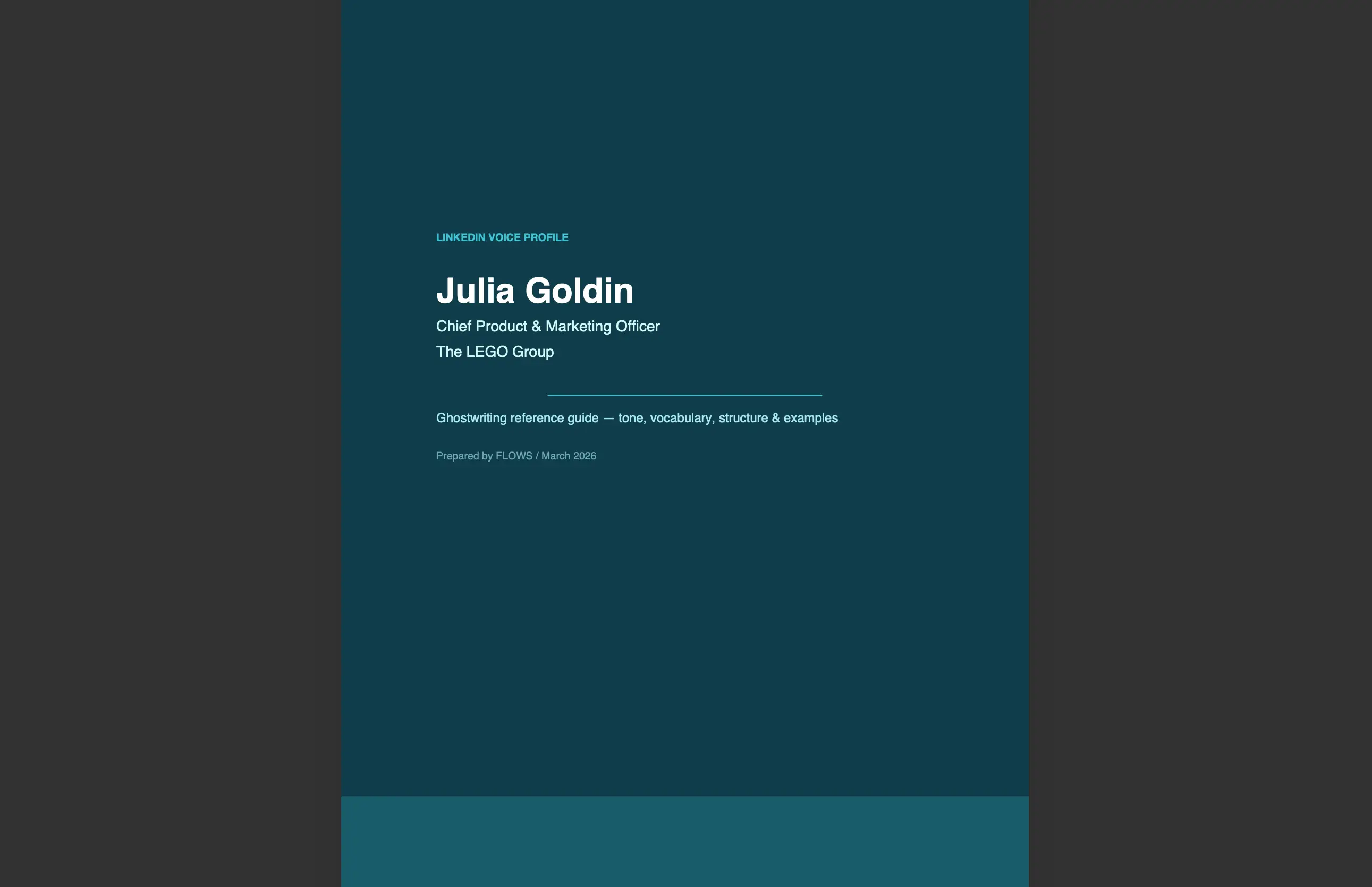 Brand voice documents describe how a person wants to sound. LinkedIn posts show how they actually sound. The gap between the two is where ghostwriting goes wrong: the brief says "authoritative but approachable" and the writer interprets that differently every time. A voice profile built from 20-30 real posts with engagement data captures the specific patterns that make a person's writing recognizable, including habits they would never think to describe in a workshop. The result is a reference document grounded in evidence, not adjectives.