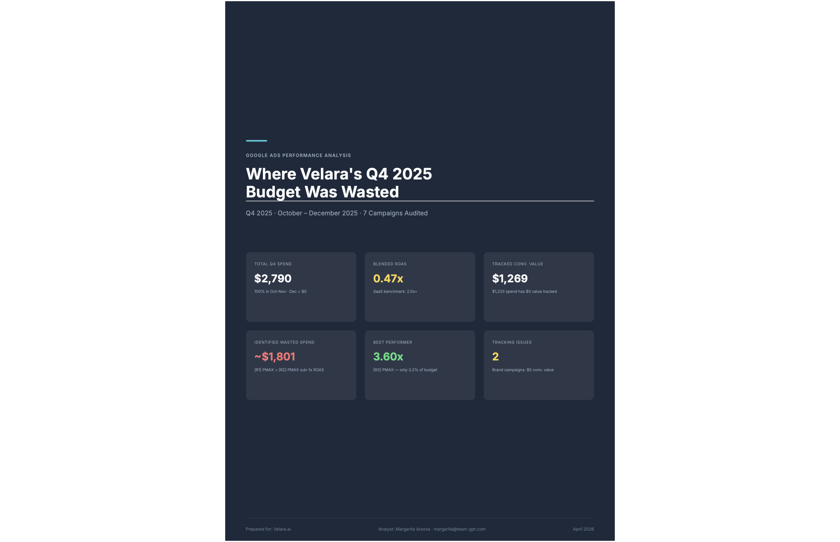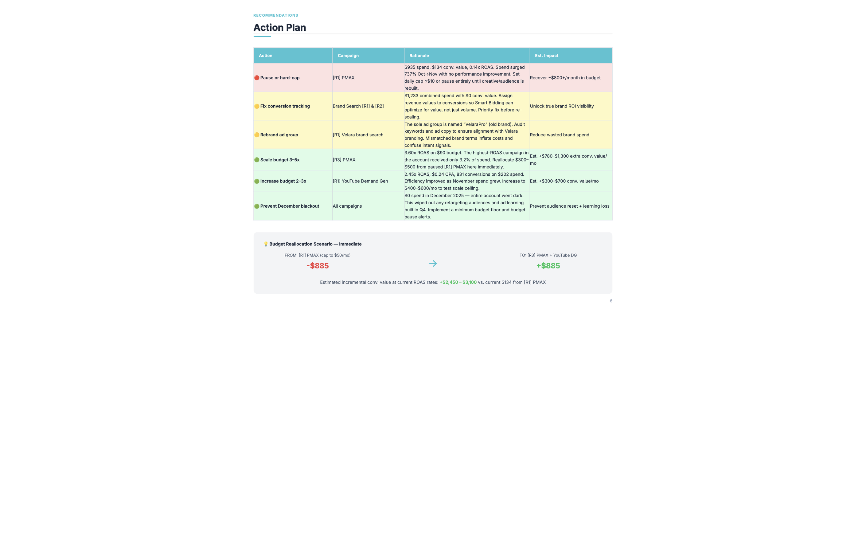 A branded PDF that scores every campaign side by side: how much each one spent, how many conversions it drove, and how efficient it was. The headline section plots budget allocation against actual results, so the team can see at a glance which campaigns are eating budget without earning it, and which ones are quietly outperforming on a shoestring. Charts make the comparison visual, and an action plan at the end spells out what to cut, what to consolidate, and what to scale, with the numbers behind each call. If any campaigns have broken or missing conversion tracking, that gets called out front and center, not hidden in a footnote.
