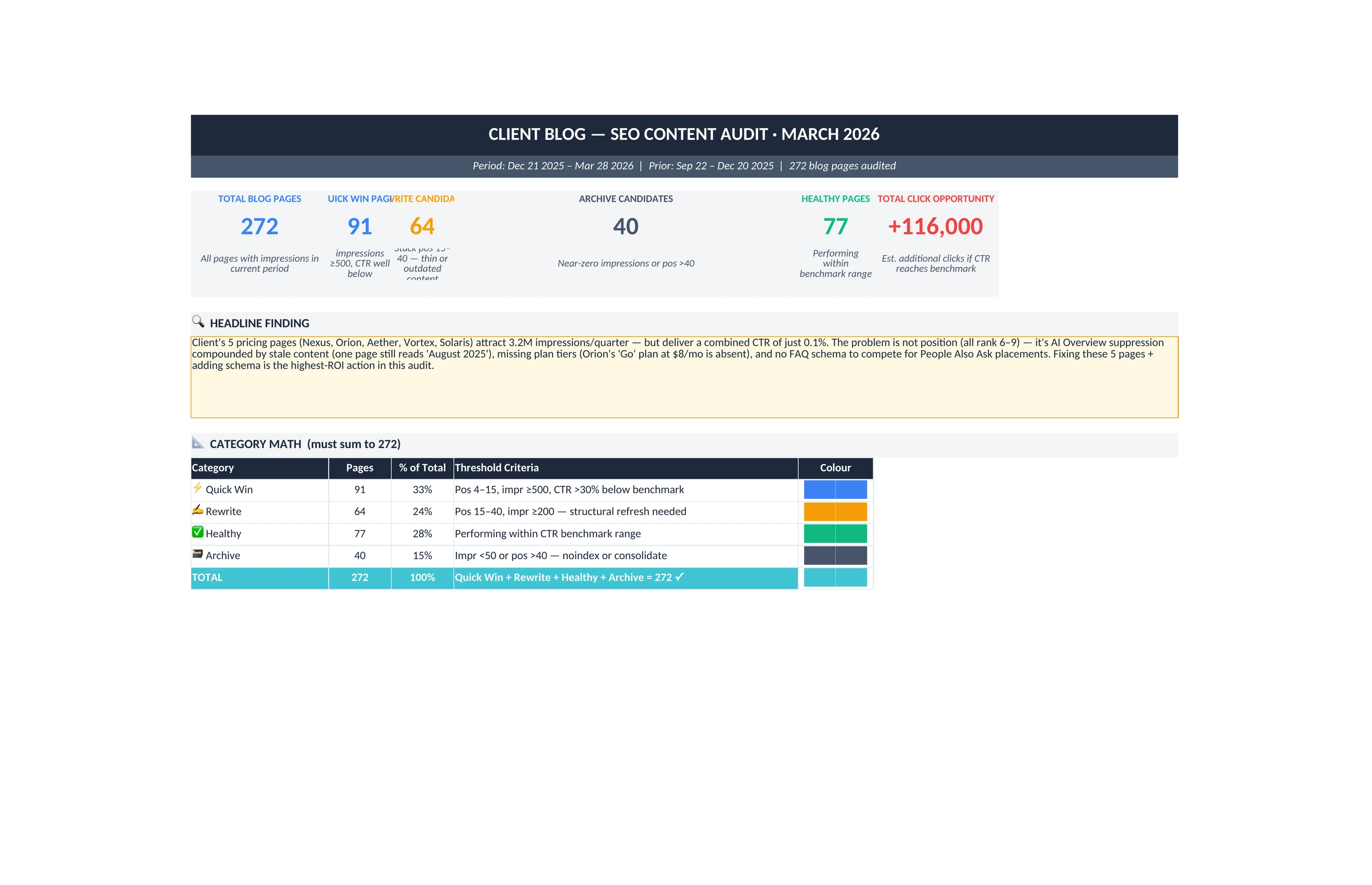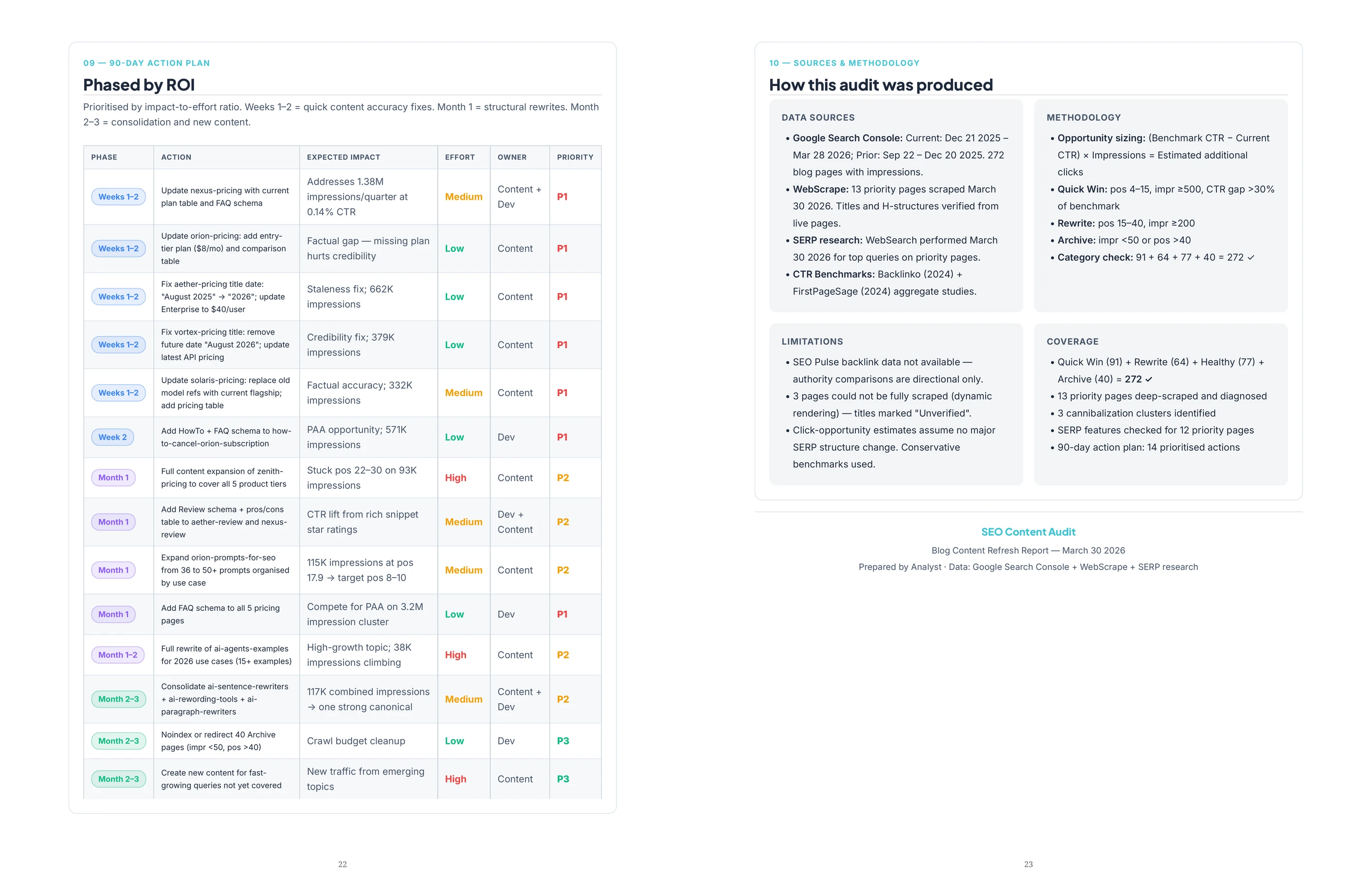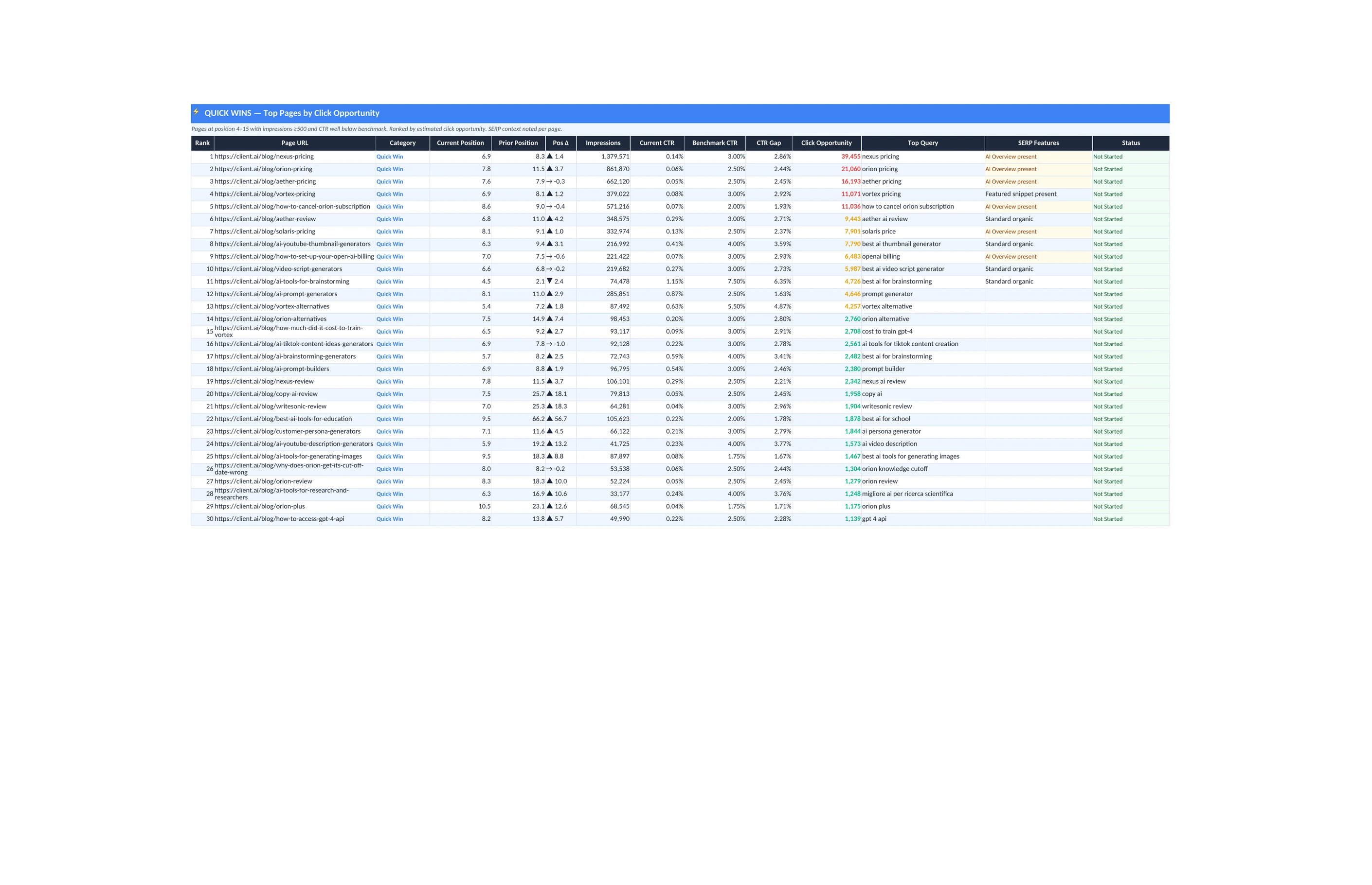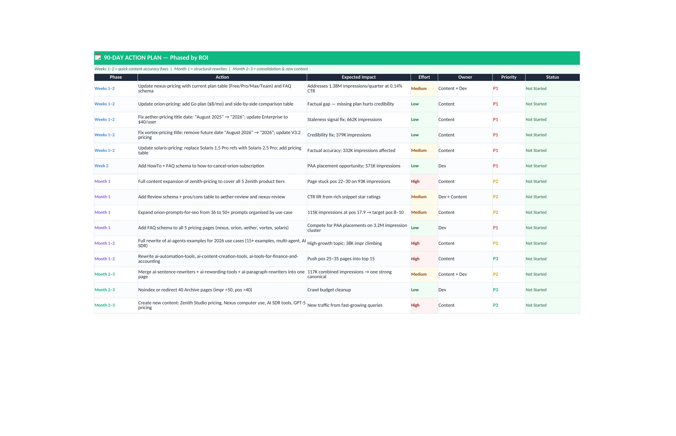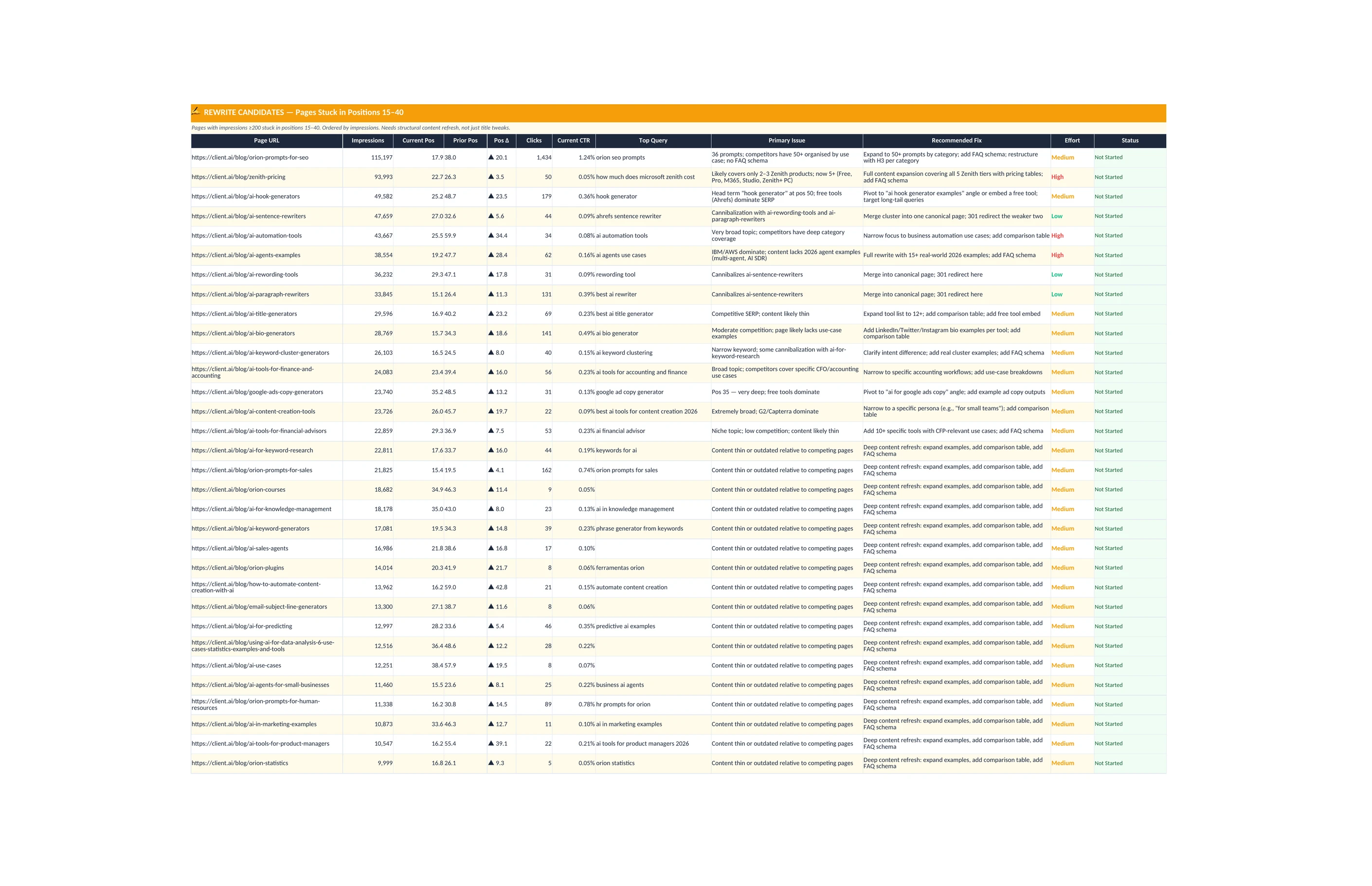 For each refresh candidate, the actual page content gets compared against what the current top-ranking competitors have. If a competitor added a comparison table, updated their pricing data, or restructured their headings since the client's page was last touched, that shows up as a specific gap. Each page on the refresh list comes with a per-page brief: what to update, what to add, and what to leave alone. The list is ranked by a combination of traffic potential and refresh effort, so the team starts with the pages that will move the numbers with the least work.