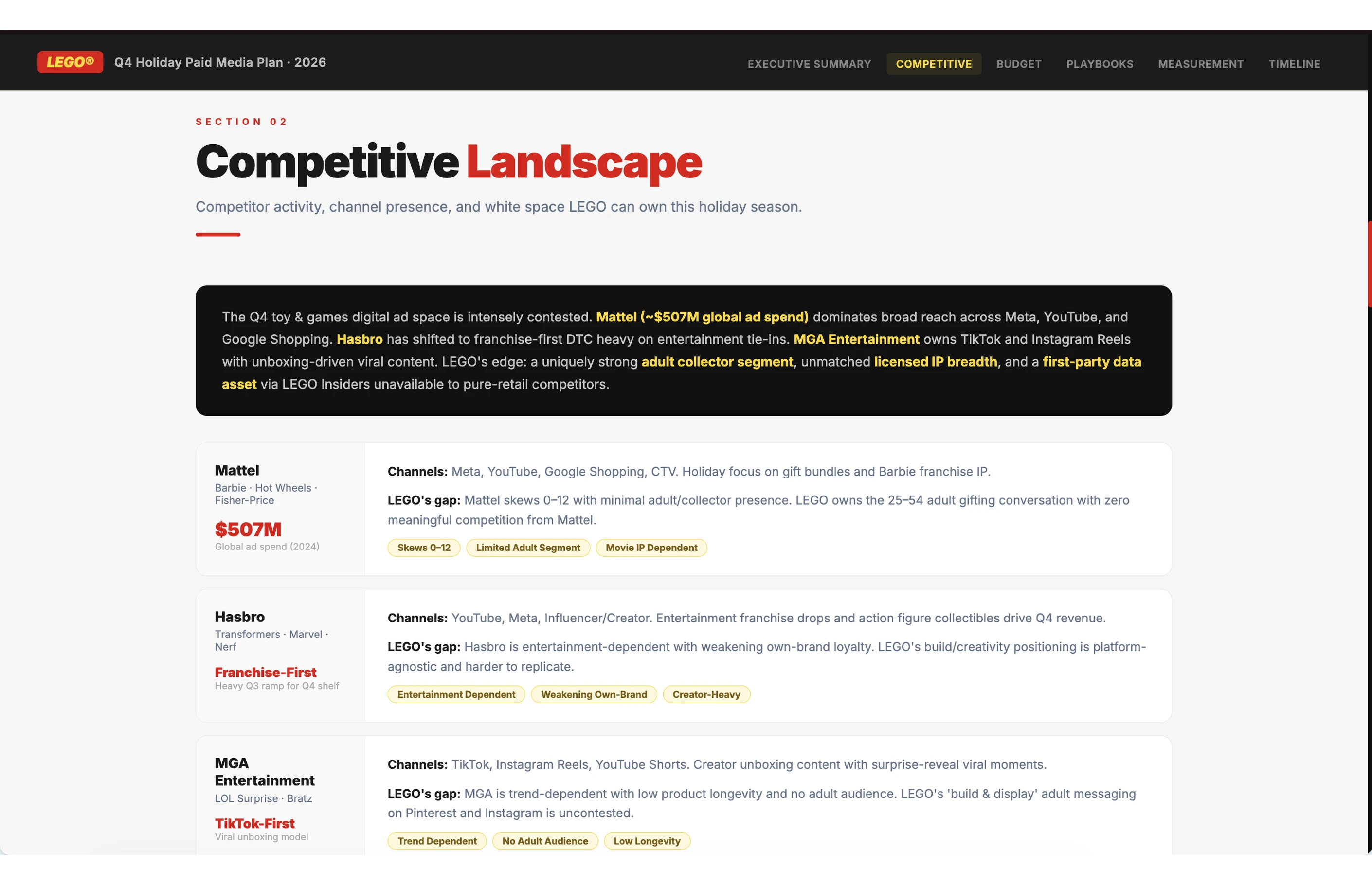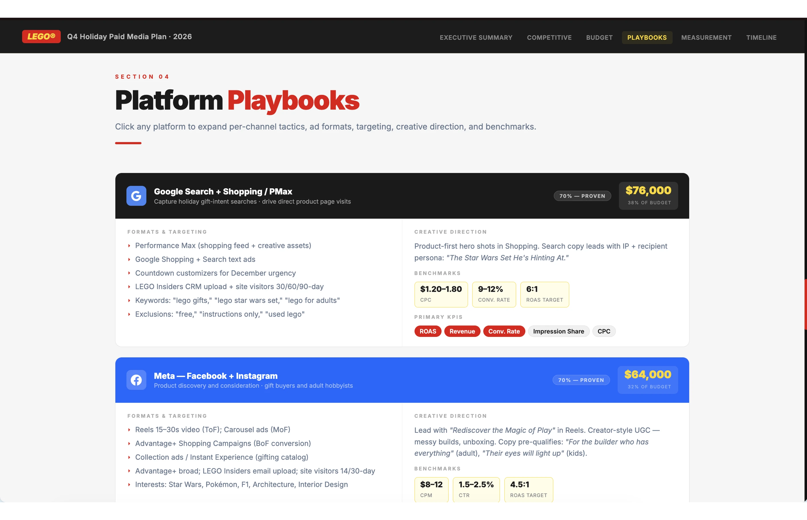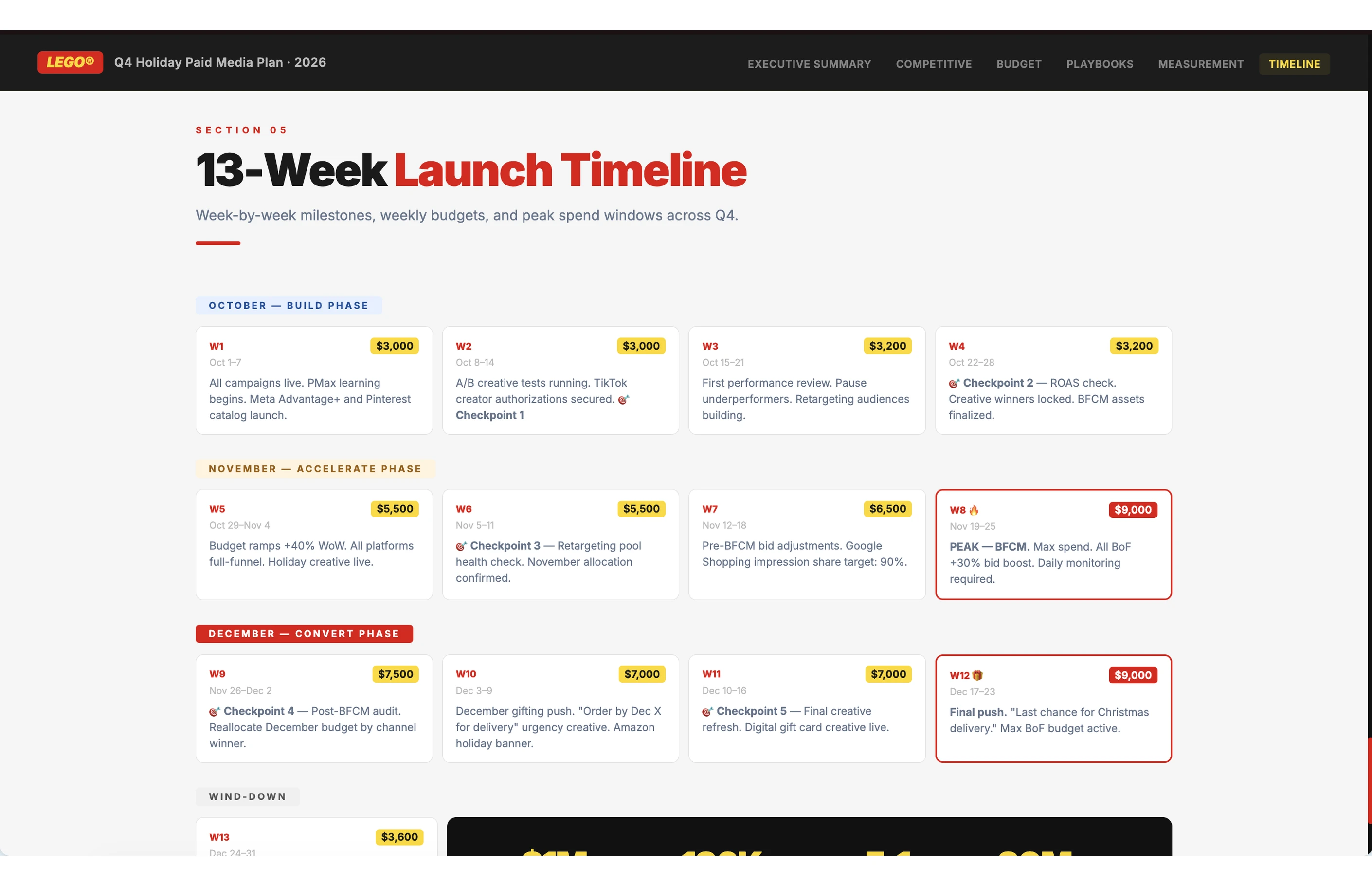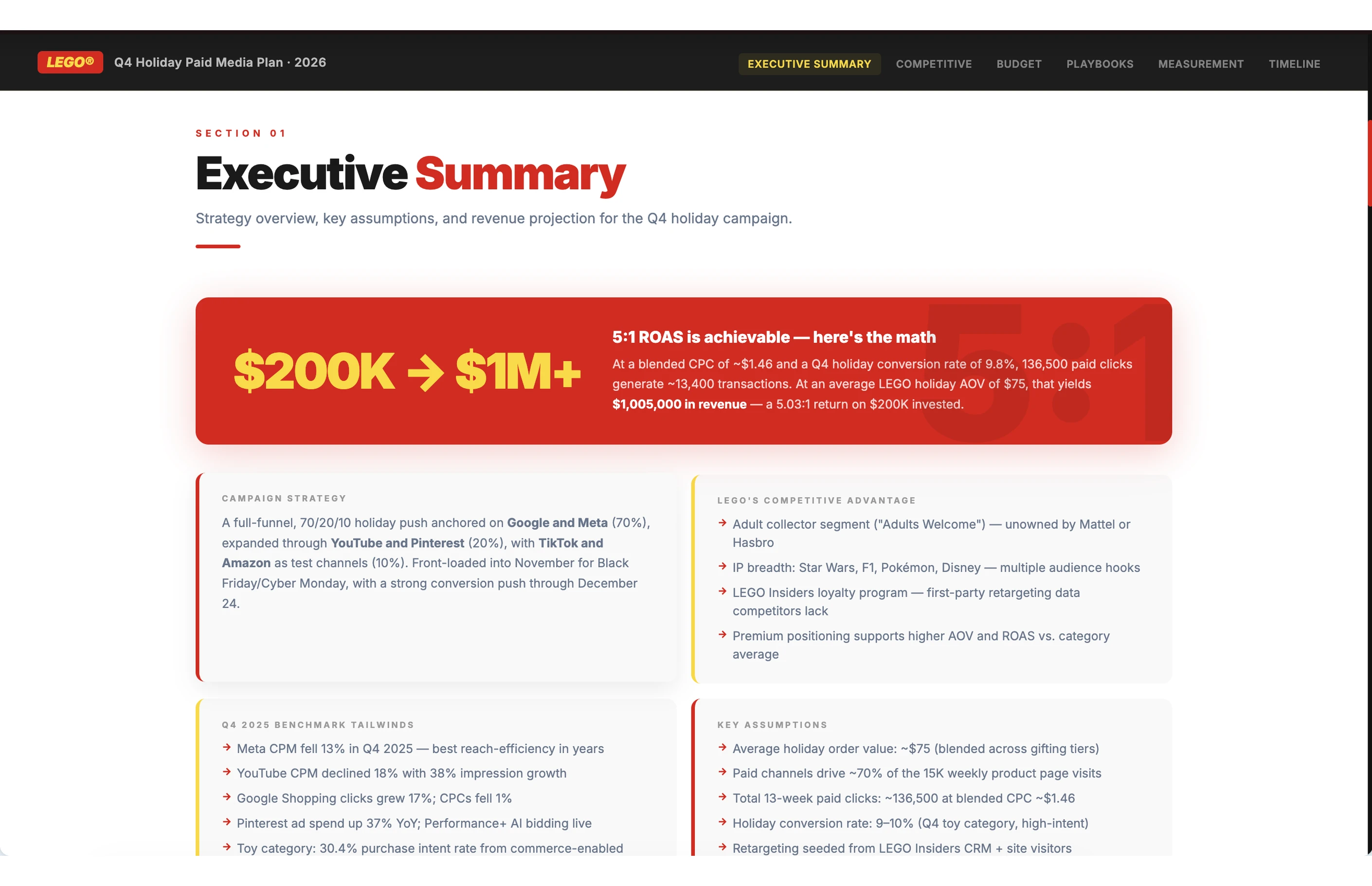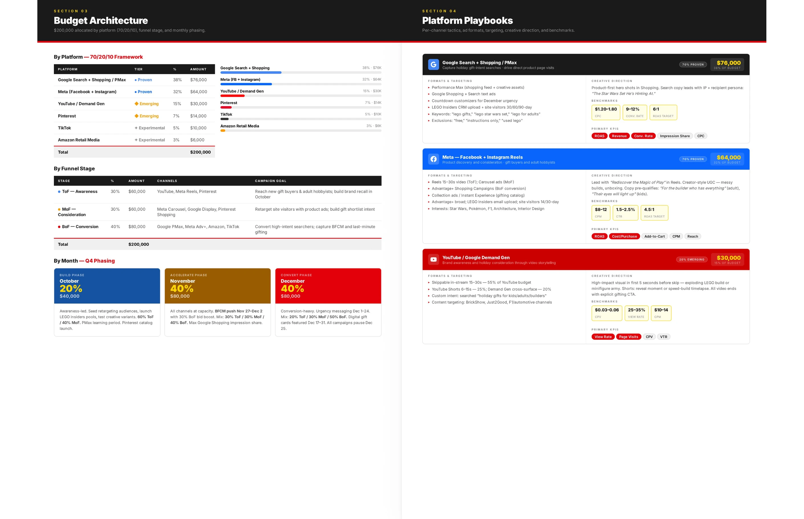 The budget plan covers four layers. A channel-by-channel allocation table with specific dollar amounts, percentage splits, and the reasoning behind each recommendation. Three scenario models (best, base, and worst case) that map out different outcomes, so the team plans for a range instead of a single number. A sensitivity analysis that identifies which variables have the biggest impact on results, like cost-per-click shifts or conversion rate changes, so the team knows where to watch closely. And a month-by-month implementation roadmap with spend targets and milestones that keeps everyone aligned on what's happening and when.